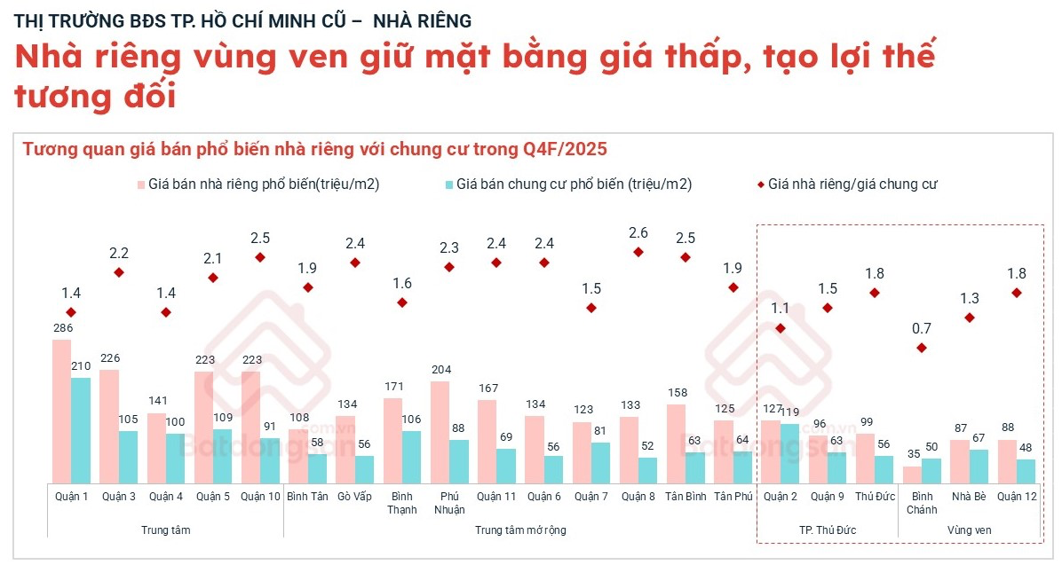 Ở phân khúc nhà riêng, giao dịch vẫn ổn định dù mức độ quan tâm chưa tăng mạnh. Theo dữ liệu của Batdongsan.com.vn, tại trung tâm TP.HCM, giá rao bán nhà riêng quý 4/2025 phổ biến khoảng 210-286 triệu đồng/m2, cao gấp 1,4-2,2 lần chung cư. Khi dịch chuyển ra các quận như Bình Thạnh, Phú Nhuận, Quận 11 hay Quận 7, mức giá giảm còn 125-204 triệu đồng/m2, cho thấy áp lực giá đã giảm lại.