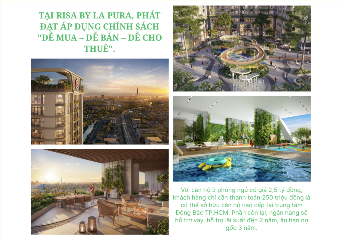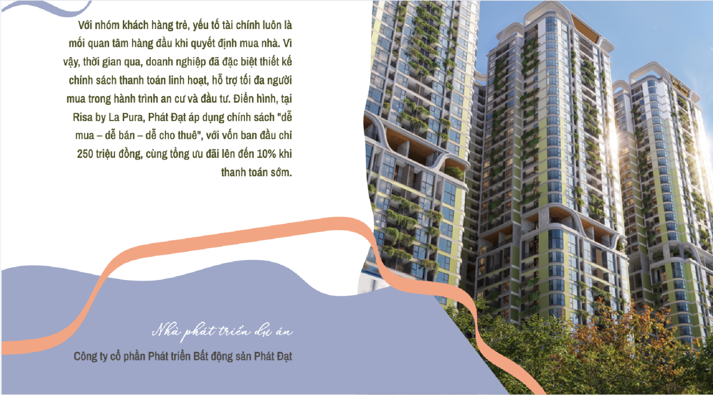Dưới góc độ Nhà phát triển dự án, đại diện Công ty cổ phần Phát triển Bất động sản Phát Đạt cho rằng, với nhóm khách hàng trẻ, yếu tố tài chính luôn là mối quan tâm hàng đầu khi quyết định mua nhà. Vì vậy, thời gian qua, doanh nghiệp đã đặc biệt thiết kế chính sách thanh toán linh hoạt, hỗ trợ tối đa người mua trong hành trình an cư và đầu tư. Điển hình, tại Risa by La Pura, Phát Đạt áp dụng chính sách “dễ mua – dễ bán – dễ cho thuê”, với vốn ban đầu chỉ 250 triệu đồng, cùng tổng ưu đãi lên đến 10% khi thanh toán sớm.