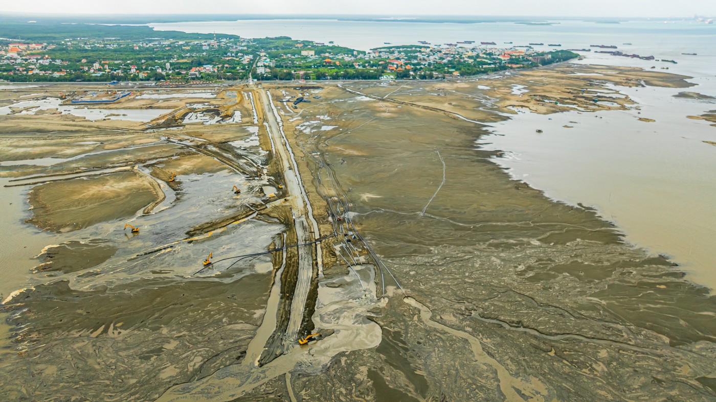 Thực tế dù mới khởi công 5 tháng, hàng trăm máy xúc, xà lan đã tiến hành san lấp, bơm cát và gia cố móng, dần hình thành mặt bằng cho các hạng mục chính.