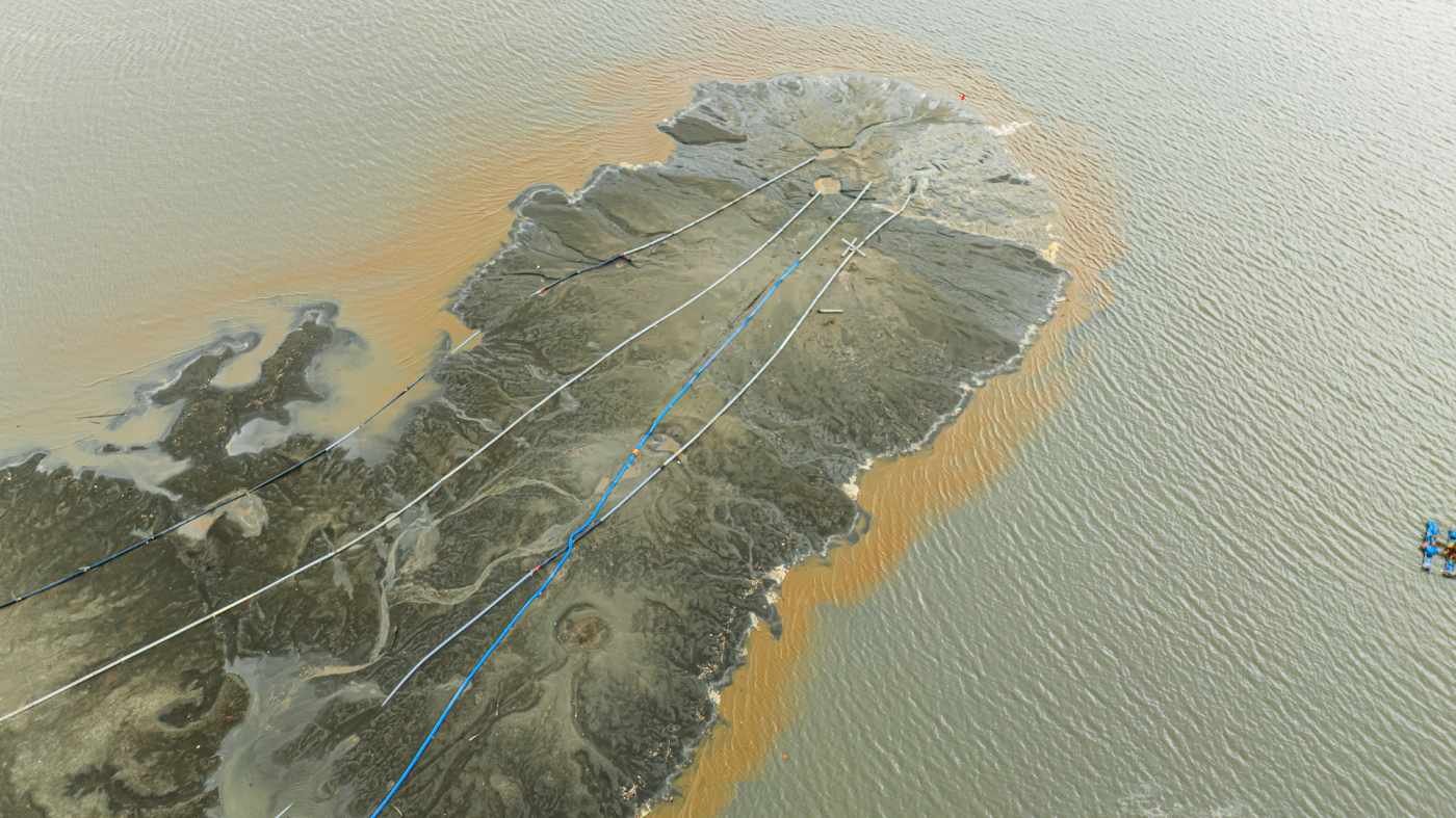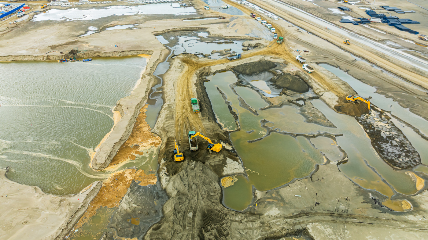 Ngoài khơi, tàu và sà lan vận chuyển vật liệu hoạt động liên tục, từng lớp cát được bồi đắp lấn dần ra biển. Tuy nhiên, do vị trí tòa tháp nằm ở đầu ngoài cùng của dự án, cách bờ biển hiện tại gần 6 km nên vẫn còn cần nhiều thời gian, mặt bằng xây tháp này mới hình thành.
