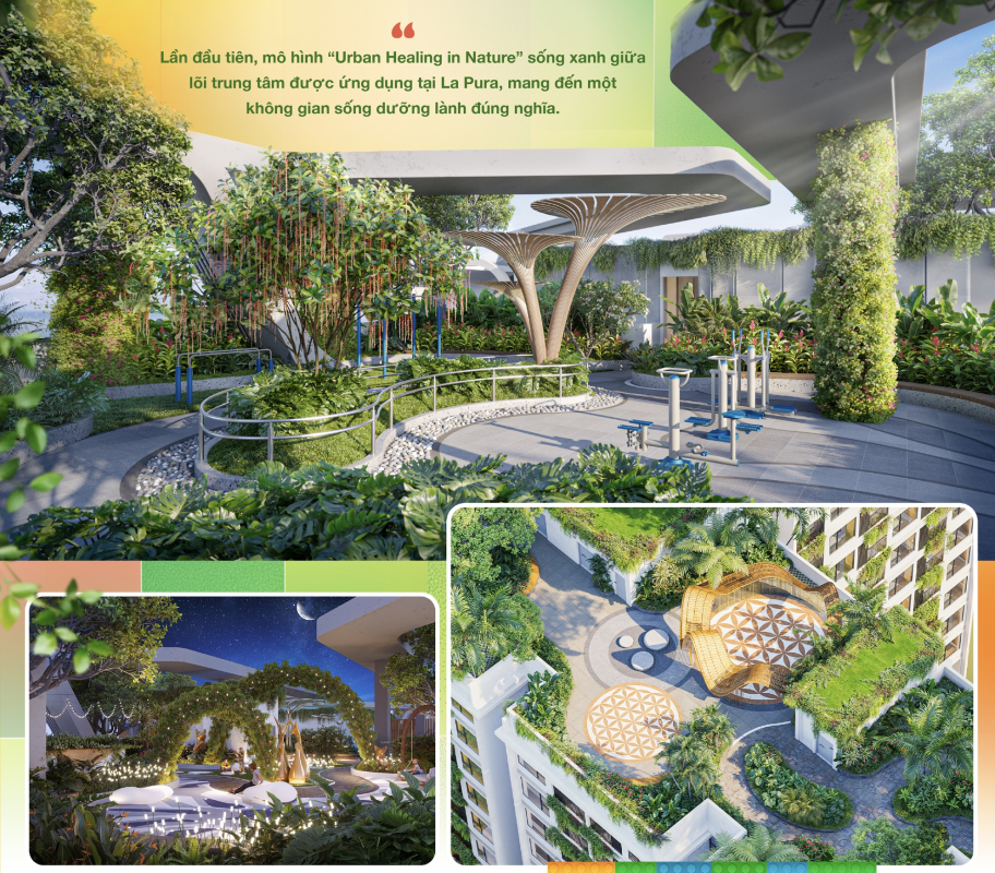 Lần đầu tiên, mô hình “Urban Healing in Nature” sống xanh giữa lõi trung tâm được ứng dụng tại La Pura, mang đến một không gian sống dưỡng lành đúng nghĩa. Dự án sở hữu 300m mặt tiền xanh, 4 tầng thiên nhiên, 10 tầng phủ cây cùng cầu hoa trên cao đầu tiên trong khu vực, tạo nên một “lá phổi xanh” hiếm có ngay trung tâm thành phố. La Pura còn gây ấn tượng với tổ hợp 12 hồ bơi đa chủ đề và hệ tiện ích vườn dưỡng lành trên mái quy mô bậc nhất.